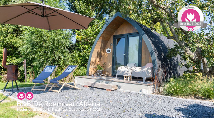 B&B de Roem van Altena is verkozen tot Beste B&B van Nederland 2023 met 2 tulpen. De B&B bestaat uit twee idyllische Scandinavische pods, die de eigenaren zelf hebben gebouwd. De indeling van elke pod is sfeervol en praktisch: alles is aanwezig voor een uniek verblijf in het pittoreske dorpje Uitwijk. Naast een eigen badkamer in de pod, beschikken beide verblijven ook over een houtgestookte hot tub die in de tuin staat. Met een lekker drankje en het prachtige weidse uitzicht erbij opgeteld, is het hier goed toeven!