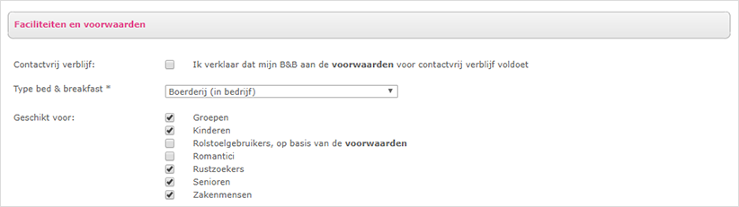 Is jouw Bed and Breakfast geschikt als contactvrije accommodatie? Dan kun je dit in de eigenarenservice registreren via de tab ‘Mijn vermelding’ bij de faciliteiten en voorwaarden. Klik vervolgens op opslaan, je B&B is dan direct zichtbaar voor sitebezoekers die filteren op Contactvrij Verblijf. Let op: indien niet aan de bovenstaande voorwaarden wordt voldaan, is Bedandbreakfast.nl gerechtigd om je B&B uit het aanbod van contactvrije B&B’s te verwijderen.